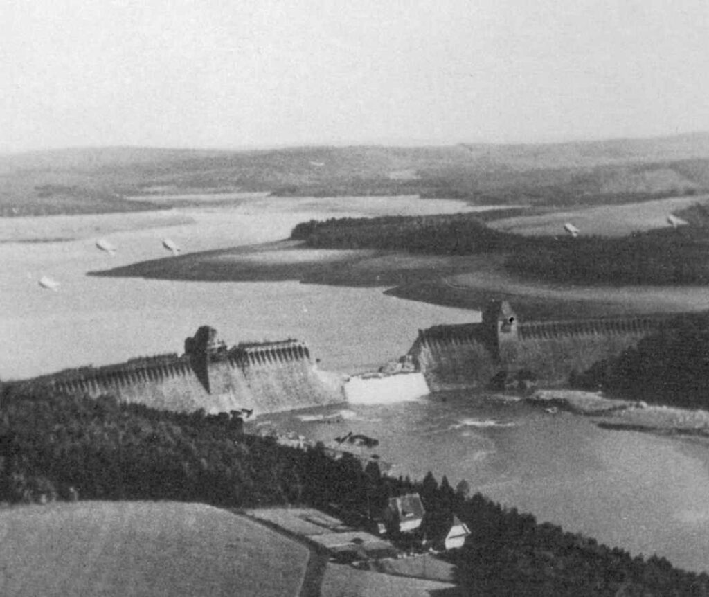 Diese ´Rotationsbombe` hüpfte zunächst mehrmals über die Wasseroberfläche, kurz vor der Sperrmauer sank sie in die Tiefe und nach etwa neun Metern, dort wo die Staumauer statisch am schwächsten ist, detonierte der Sprengkörper.